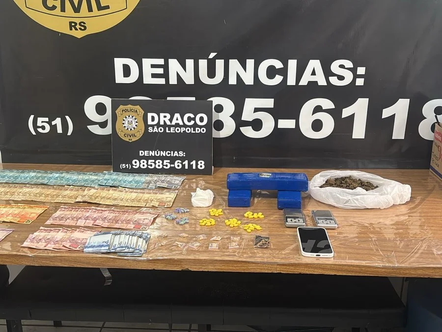 Durante o cumprimento das ordens judiciais, os policiais apreenderam diversos tipos de drogas e outros materiais ligados ao crime. Entre os itens recolhidos estavam três tijolos de maconha, porções de cocaína, MDMA, LSD e 78 comprimidos de ecstasy, além de dinheiro em espécie e um aparelho celular.